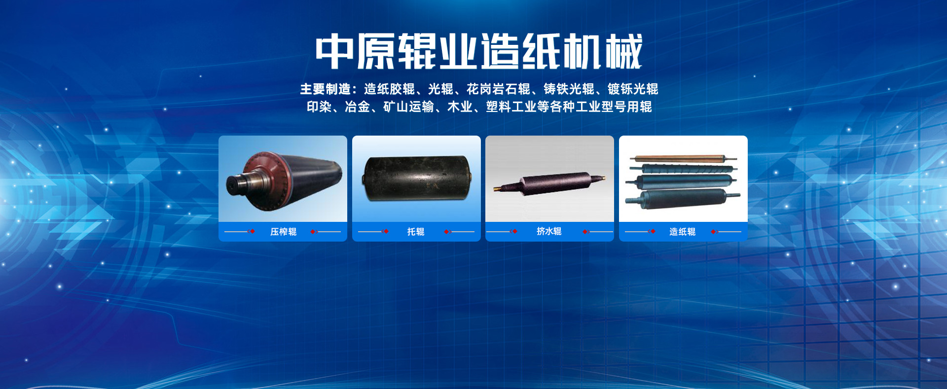 主要制造:造紙膠輥、光輥、花崗巖石輥、鑄鐵光輥、鍍鑠光輥、印染、冶金、礦山運輸、木業(yè)、塑料工業(yè)等各種工業(yè)型號用輥
